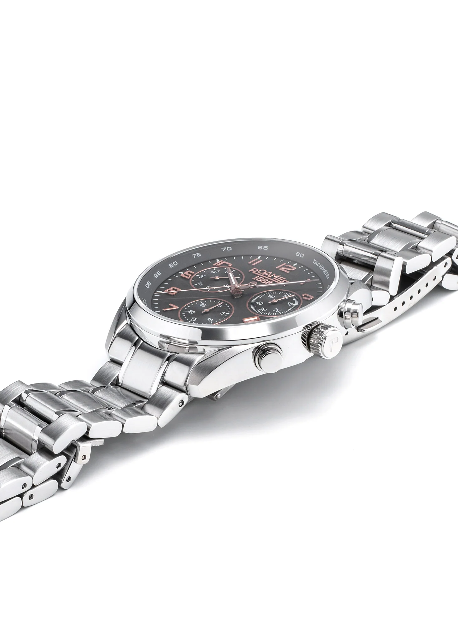 A swiss quartz chronograph movement ensures accurate, dependable timing.
