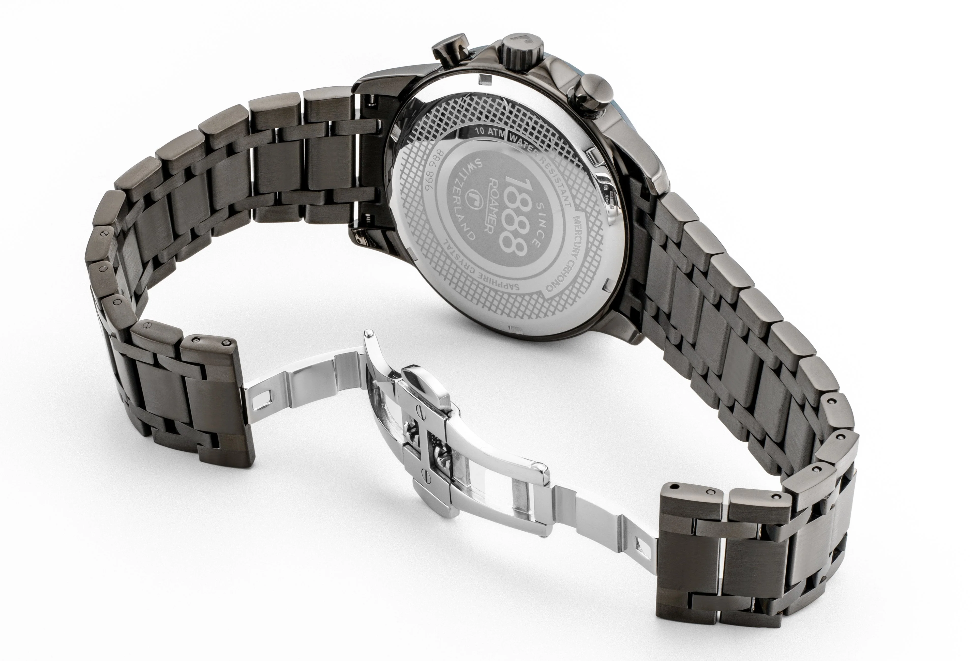 Equipped with a Swiss quartz chronograph movement, the watch delivers reliable performance day after day. The stainless steel bracelet, finished in matching gun colour and secured by a butterfly clasp, ensures a seamless, balanced fit on the wrist.